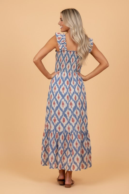 Boho Geometric Smocked Square Neck Ruffle Dress